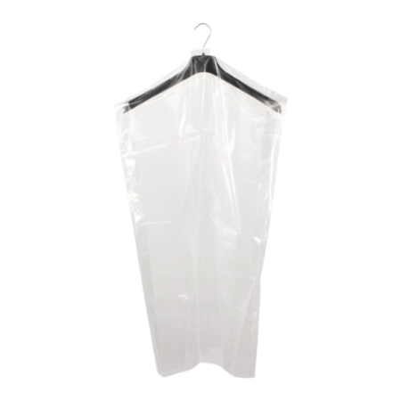 Sacco trasparente in PE con gancio, ideale per proteggere capi da polvere e umidità durante trasporto e consegna.